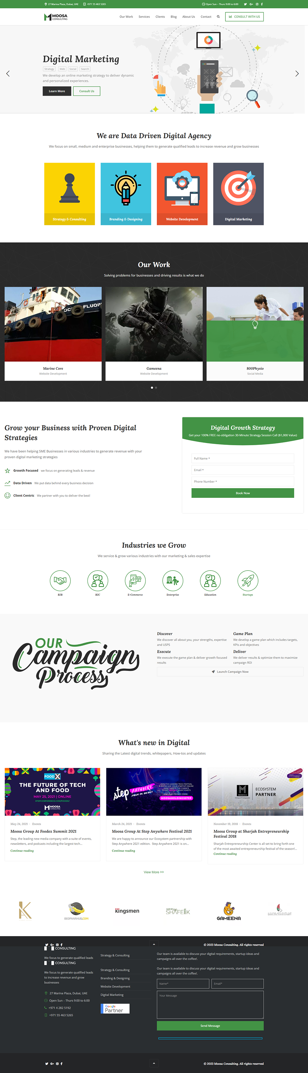 Utilizing Elementor and Figma, our team crafted a visually appealing design that not only reflected Moosa Consulting’s professionalism but also provided an intuitive user experience. The design elements were tailored to convey the breadth of their consulting services.
